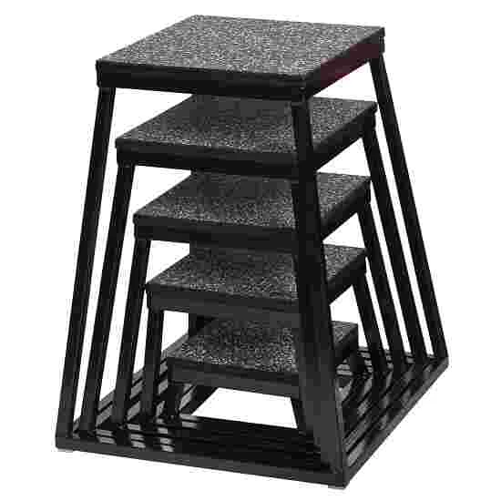 The Sport-Thieme plyo box set impresses with the individual boxes’ high degree of stability. The fully welded construction makes this piece of training equipment very sturdy and, thanks to the rubberised surface, ensure improved safety for your training session. Five different heights make your training versatile and diverse. After training, the trapezium-shaped boxes can be stored in space-saving manner.